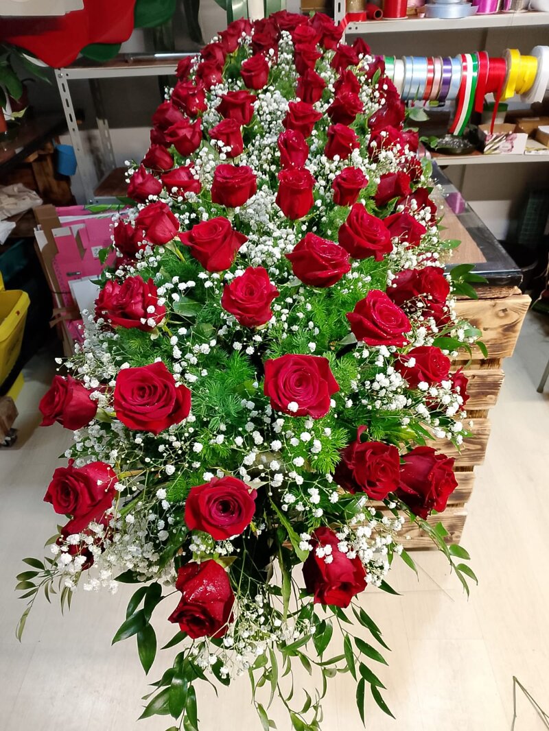 Copribara realizzato con rose rosse ed almeno due tipi di verde. Può essere realizzato con o senza carta da regalo in base alle richieste.